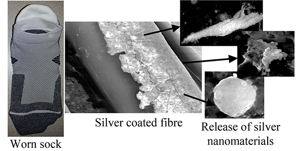 Graphical abstract showing a worn sock, silver-coated fibre, and the release of silver nanomaterials