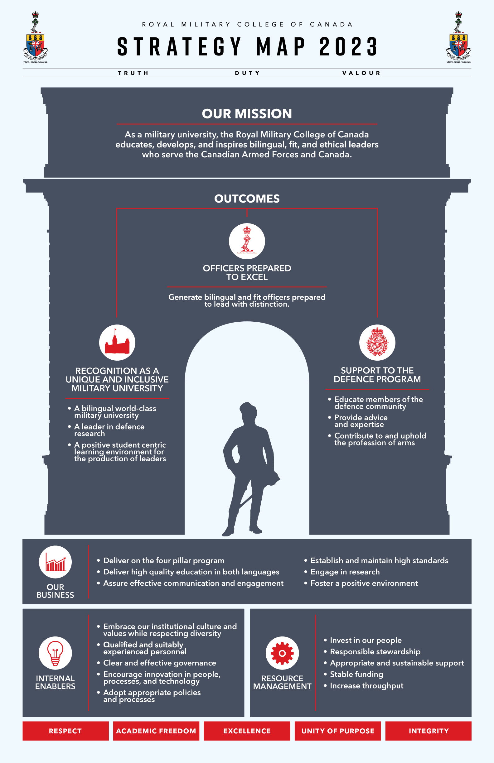Duty With Honour defines the profession of arms for the Canadian Armed Forces and is the end state for the implementation of Officership 2020. RMC contributes to this effort and is a standard-bearer for its success both in the delivery of graduates ready for commissioning and in the development and delivery of the advanced education that is necessary to develop officers through all five Development Period levelsFootnote 9.