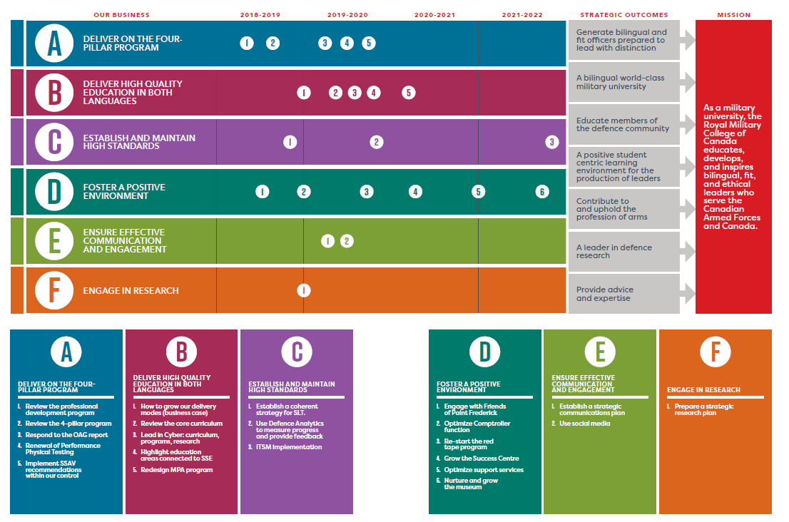We began strategic planning with a retreat in June 2018 to gather our people in a venue that provided the necessary time to think about and discuss the issues RMC is facing. Participants prepared for the retreat by reviewing previous strategic planning reports, the SSAV and OAG reports, the CDS Initiating Directive and our progress on implementing the SSAV recommendations. Subsequently, we received the BOI report and incorporated it into our considerations. This strategic plan builds on our on-going response to the SSAV, OAG and BOI reports and describes how we will live up to the tradition that sets RMC apart from others.