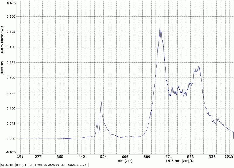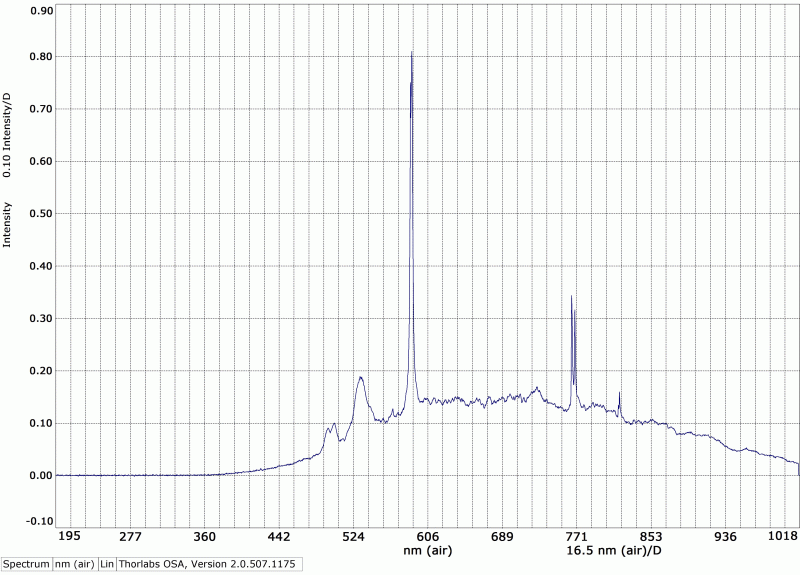 Figure 1: Verre soda-lime. Les positions des pics spectroscopiques correspondent aux émissions de divers constituants. Les positions des pics à  496nm, 503nm, 532nm, 589nm (un gros étroit indiquant la présence du Na dans ce type de verre), un doublet d’émission avec doublet à 766nm et 769nm ( indiquant la présence du K dans ce type de verre) ainsi qu’un pic étroit à 818nm.