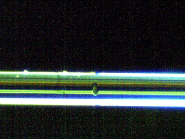 La figure 6 montre une fibre optique µ-usinée par laser CO2. On peut voir un trou d’environ 50 à 60 µm au travers de la fibre.